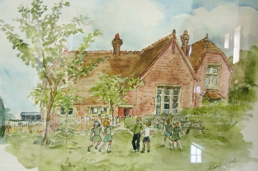 Mary Hood Watercolour School with children playing in the field in foreground Watercolour "Quarry Street, Leamington" and sundry unframed prints