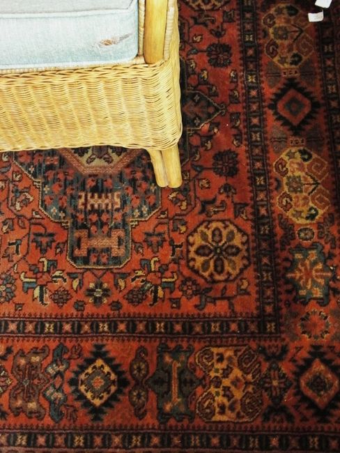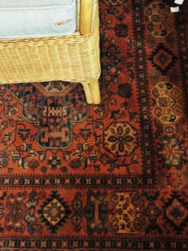 A Baluchi pattern wool rug with overall red field and three central medallions and floral pattern surround within multiple borders, 203cm x 138cm