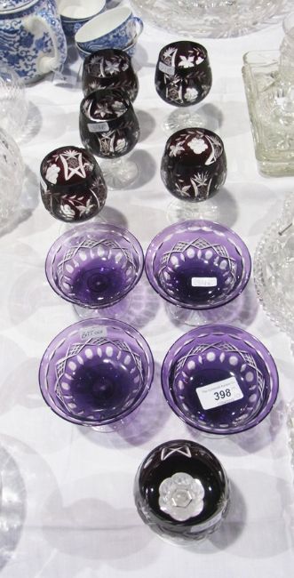 Six clear and ruby cut wines and four purple and clear moulded sundae dishes