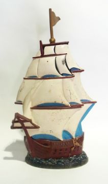 Cast iron model of a Galleon and a fire iron companion set holder, 45cm