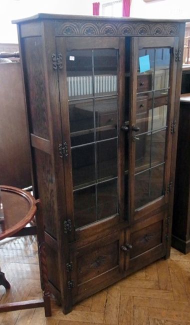A reproduction oak raised leaded lights bookcase enclosing four shelves, a pair of panel cupboard doors below on stile supports, width 91cms