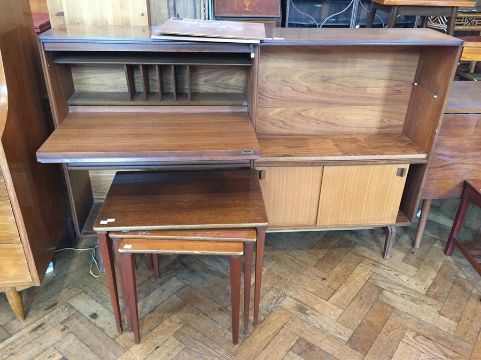 Modern Ercol type side cabinet with integrated desk, open bookcase, cupboards, etc. 154cm and nest of three rectangular topped occasional tables