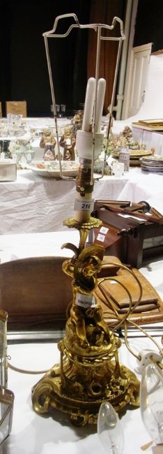 A decorative brass lamp with a cherub holding the light, on a stem, floral scroll base