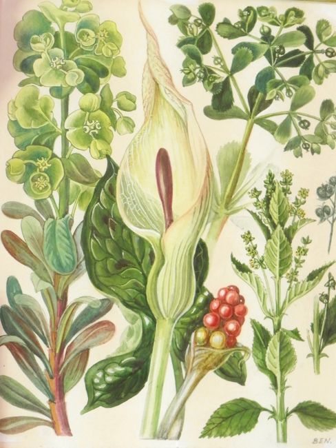 Three mounted sets of four botanical watercolour drawings, used in the Oxford Book of Wildflowers, each plate signed in pencil "Ben", see verso for details