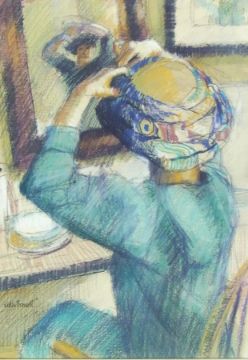 Keith Bennett Pastel drawing Woman adjusting hat in front of a mirror, signed, 37cm x 27cm