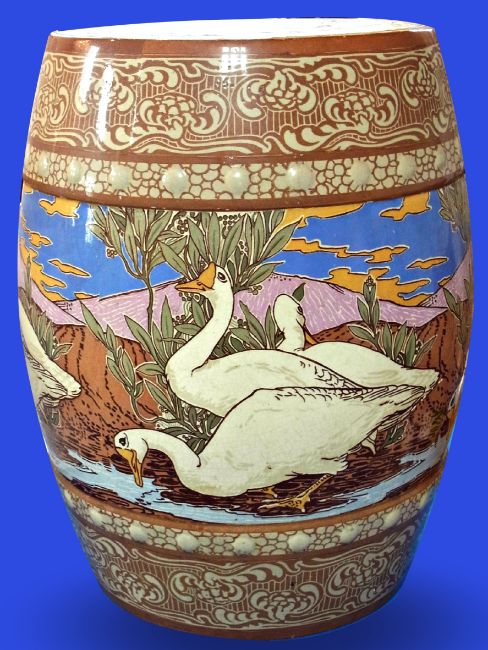 Mintons earthenware barrel garden seat, painted with swans and having stylised foliate borders, riveted