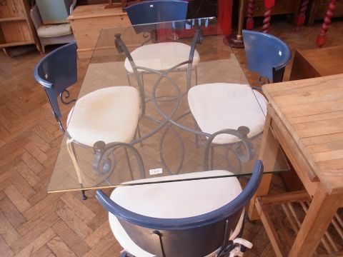 Rectangular glass topped conservatory table with blue painted iron rail supports together with set of 4 matching chairs with loose cushion seats, table - 140 cms