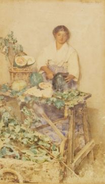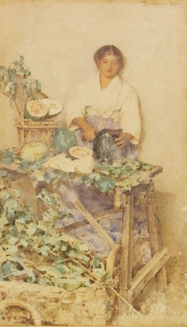 19th century school Pair of watercolour drawings Girl selling melon and girl selling fish, both signed "Monte...-Napoli", 58cm x 23cm (af) and another Watercolour drawing Still life of roses (3)