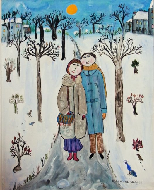 Dora Holzhandler (b.1928) Oil on canvas Winter landscape with figures on path, signed and dated '85, 50cm x 40cm