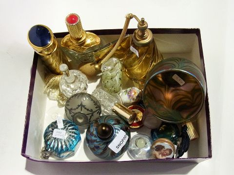 A collection of glass perfume bottles and other sundry items