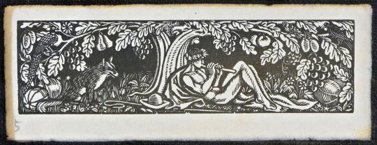 Gwen Raverat (1885-1957) Four wood engravings Pan playing pipe, deer chased by a leopard, goats and rhinos and turtles and frogs, Nos.5, 11 and 15, 12.5cm x 5cm