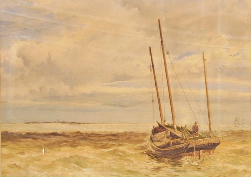 19th century school Watercolour drawing Seascape with fishing vessel in foreground, marked "Lucksall, Lowestoft" with views of Holland in the distance, 45cm x 65cm