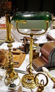 A brass and glass desk light and another brass table lamp on scroll supports