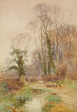 Watercolour drawing Henry Charles Fox (1860-1929) Wooded landscape with shepherd and sheep walking along lane and stream in foreground, signed, 76cm x 54cm