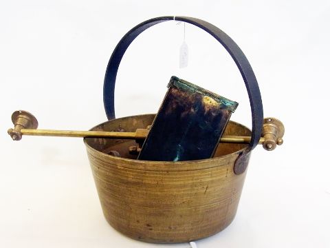 Brass jam pan, cobblers last, brass wall mounted candle holder and another