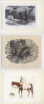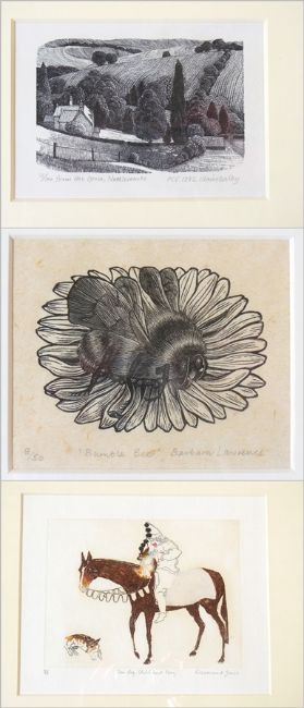 Rosamund JonesColour print"Our Dog, Child and Pony", the dog and child wearing clown's hat, 4/75, signed and titled in pencilBarbara LawrenceWood engraving"Bumble Bee", 8/50 Claire Dalby"From the Grove, Nettlecombe", 75/100