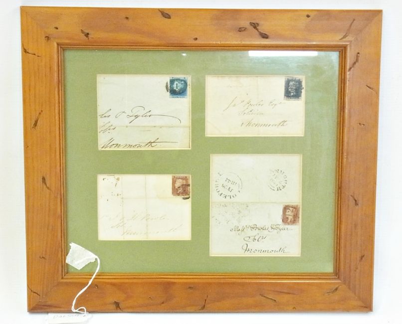 4 Mid 19th Century stamped envelopes, framed 1 x ld black and 2 x 1ld