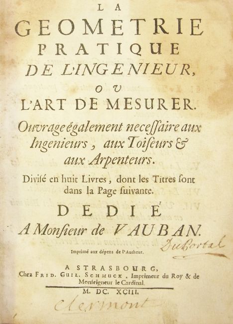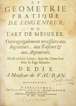 Doyem Guillame " La Geometrie Pratique de L'Ingenieur, o u L'Art de Mesurer...dedie a Monsieur de Vauban" published Strasbourg 1693, numerous folding plates, with diagrams etc., some staining throughout, contemporary full leather boards and La Sainte Bible in two vols, and 4 antiquarian vols in French (7)