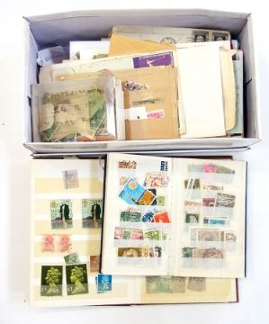 Quantity of loose stamps, covers, etc. (1 box), and two small sundry stockbooks (one blue, one brown) (3)