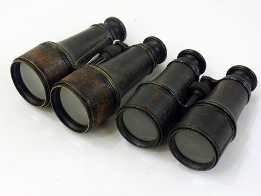 Pair binoculars by J H Steward, The Strand, London and another pair, both black morocco bound and black japanned metal (2)