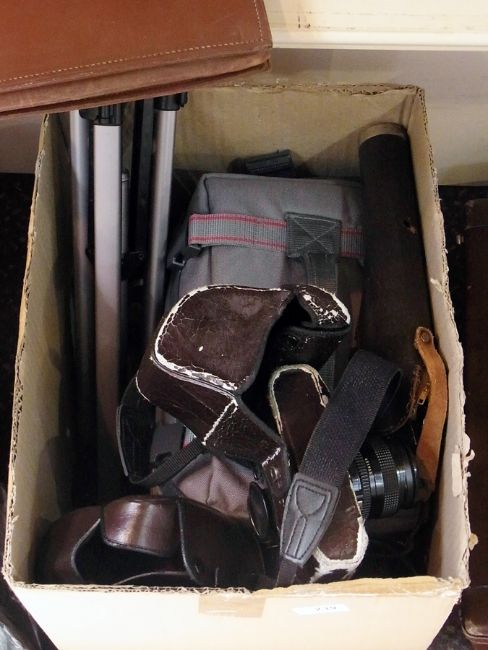 A collection of cameras, tripods and other camera paraphernalia such as the Cannon AE1 program