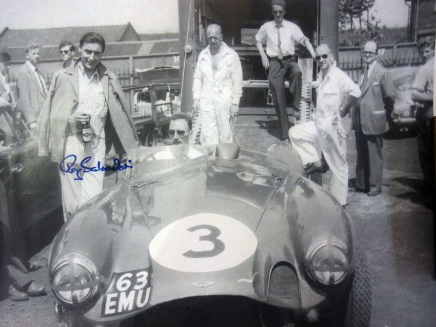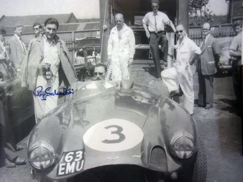 Black and white poster of original photograph from 1959 Le Mans signed by Roy Salvadori, driver of the winning Aston Martin 1959 and Maurice Trintignant driver of the 2nd placed Aston Martin and another poster of the drivers