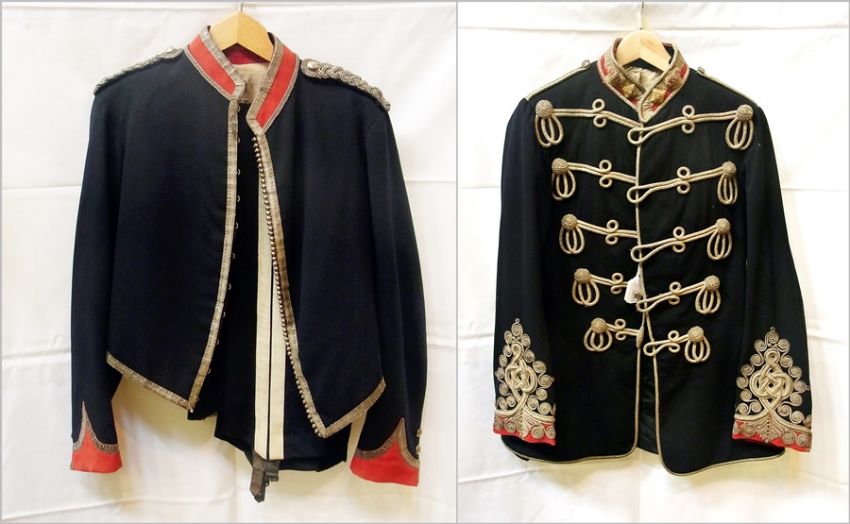 Queens own Yeomanry uniform. consisting of dress jacket, mess dress jacket, waistcoat, and trousers. The uniform has rank markings of a lieutenant colonel