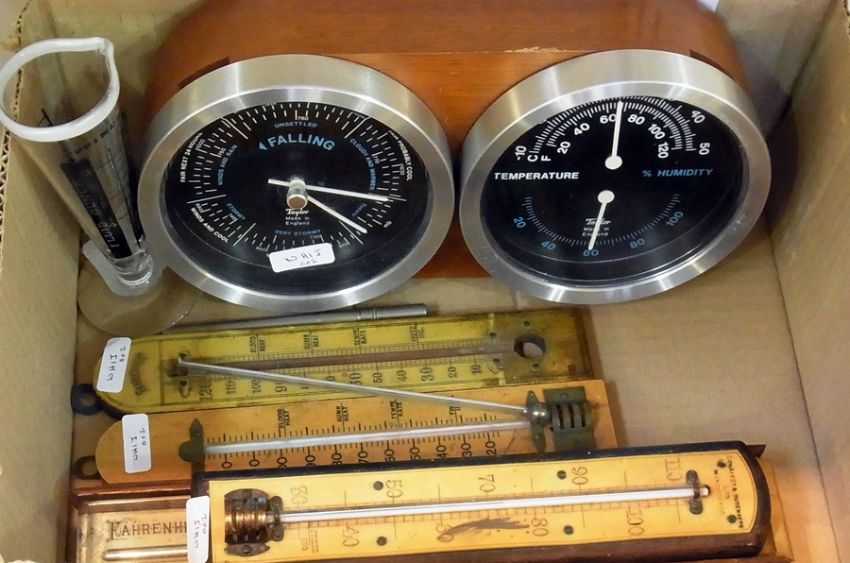 Pair Taylor dials viz:- barometer and another temperature and humidity, quantity thermometers and a glass measuring jar