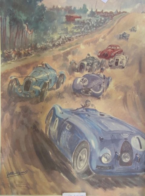 Two colour poster prints after a painting of Le Mans 1950's car race, signed by Maurice Trintignant (unframed)