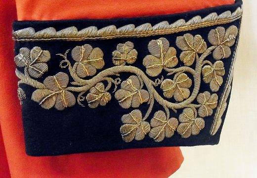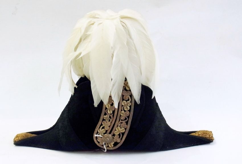 Sir W. H. Wilson-Fitzgerald Victorian Lord Lieutenant of the County of Clare, Court Dress uniform. William Henry Wilson-Fitzgerald, born 30th June 1844, Lived at Adeohi, Corrofin in County Clare, 1882, appointed high sheriff of County Clare, died in 1932, tunic made in Ireland by J. B Johnson for Wilson-Fitzgerald, scarlet superfine cloth, dark blue collar and cuffs, silver shamrock embroidery, full set of 11 marching silver buttons made by Jennings, trousers, dark blue, with 1 3/4 silver shamrock lace, cocked hat, J. B Johnson, silver shamrock embroidered, plume is original to the hat, waist belt, scarlet leather, silver lace, shamrock design, waist belt clasp, shamrock wreath with VP cipher, uniform , dated 9th of September 1891