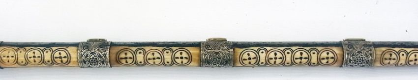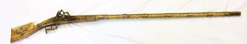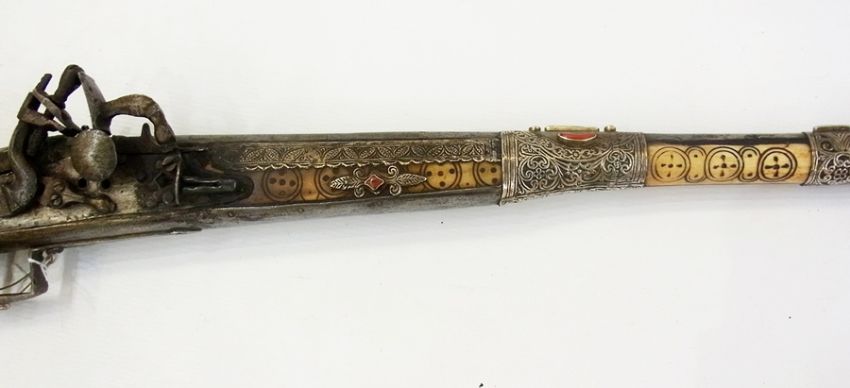 Jezail style musket, decorated with white metal mounts and semi precious stone