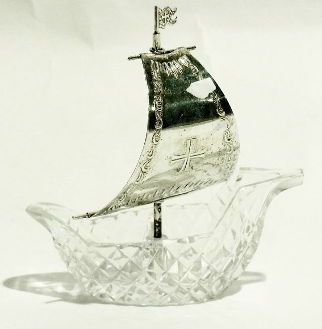 An Edwardian silver napkin ring, a cut glass boat-shaped bowl with white metal sail, a silver plate rectangular cigarette box with engine-turned top and a quantity of small flatware to include sugar nips, coffee spoons, etc.