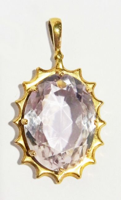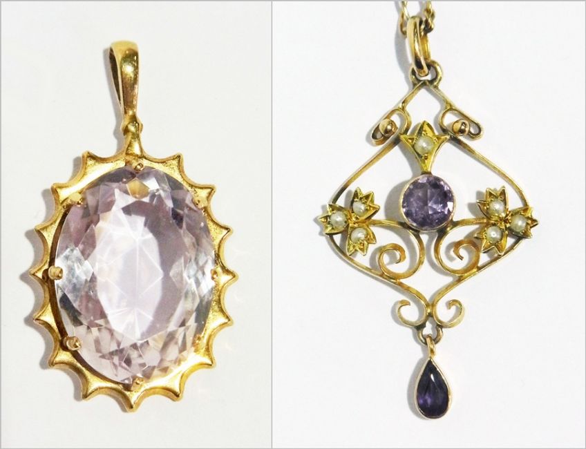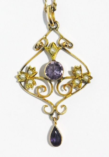 Edwardian 9ct gold, amethyst and seedpearl scroll pendant with drop, on chain and another amethyst stone set pendant