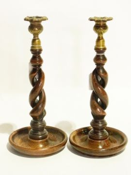 Two wooden turned candlesticks with brass candlestick holders and a framed tapestry