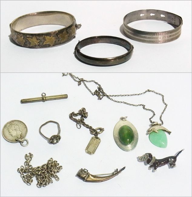 Silver belt-pattern bangle, another gold leaf decorated, child's silver bangle (af), diamante and enamel dachshund brooch and other silver and other items