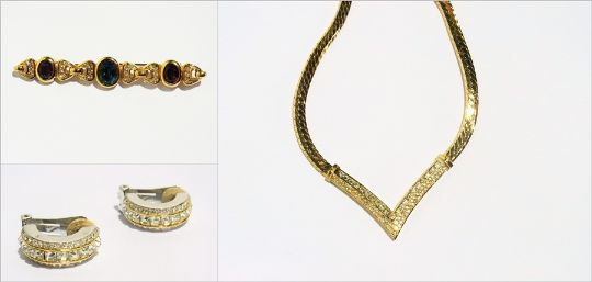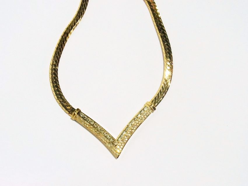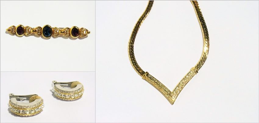 Quantity of Christian Dior costume jewellery to include pair half-hoop paste earrings with similar necklace, flat link gilt metal necklace to arrowhead paste face and a decorative bar brooch