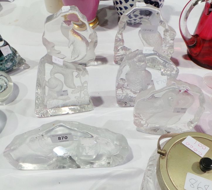 Six glass intaglio ornaments/paperweights showing various birds and animals by Mats Jonasson (Signature collection Sweden) (6)