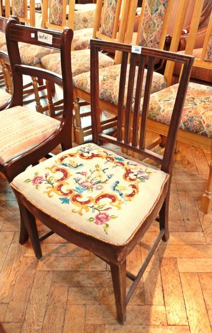 A mahogany dining chair with upholstered seat, railback