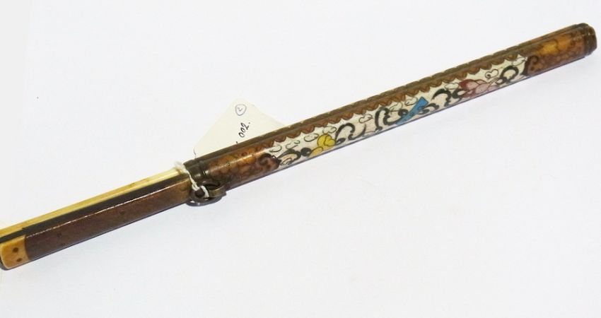 Roman amber-coloured glass bangle with applied decoration, 7cm diameter, two turquoise blue glass bangles, 5cm diameter and Chinese chopstick set comprising pair ivory chopsticks and wooden ivory handle knife in fitted cloisonne enamel case with ring suspension, 30cms long (4)