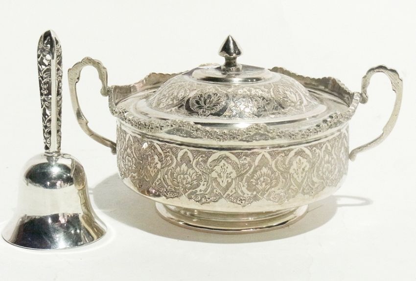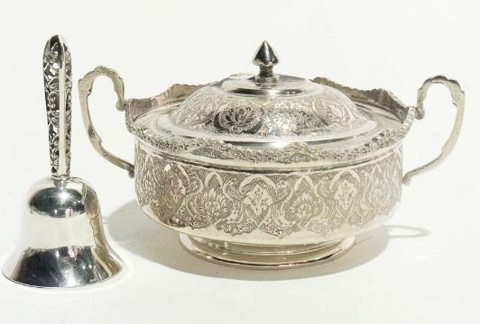 A foreign white metal two-handled bowl and cover on a raised circular foot together with a white metal table bell with open pierced fretwork handle