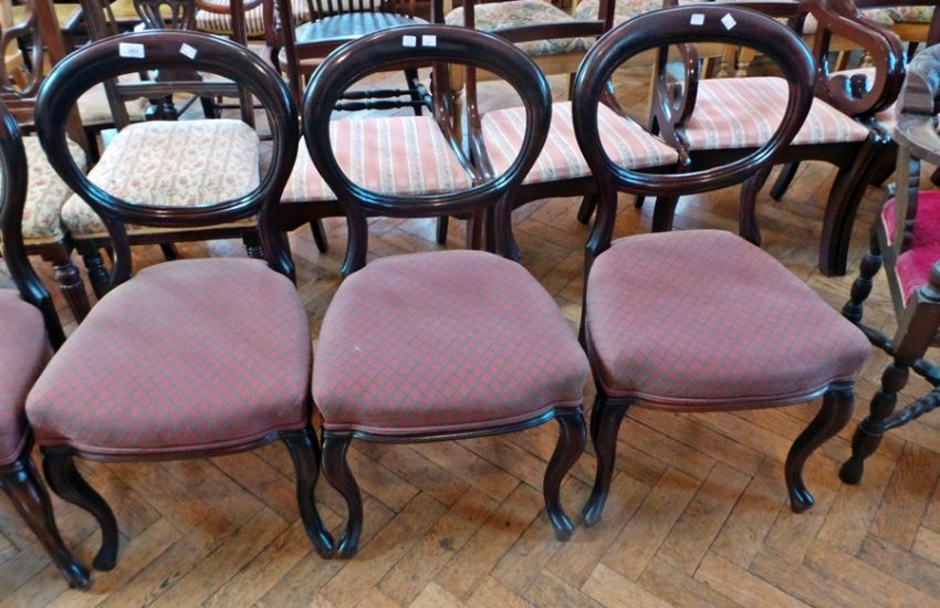 Set of eight stained hardwood balloon back chairs on cabriole legs with claw and ball feet, pink and green check upholstery