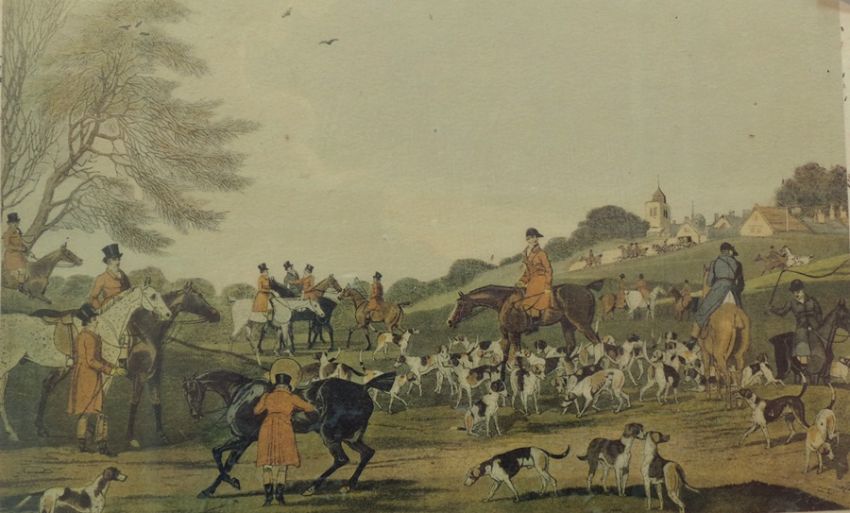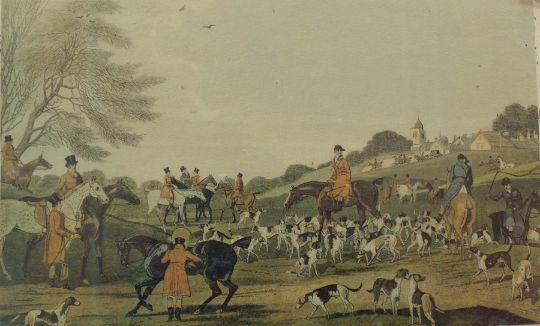 Claude A Rowbotham Miniature lithograph "Lizard Downs" Unattributed Etching Continental city river landscape After Lionel Edwards Colour print "The Earl of Berkeley's, Almondsbury", another "The Cottesmore", three other hunting prints and three miniature aquatints (10)