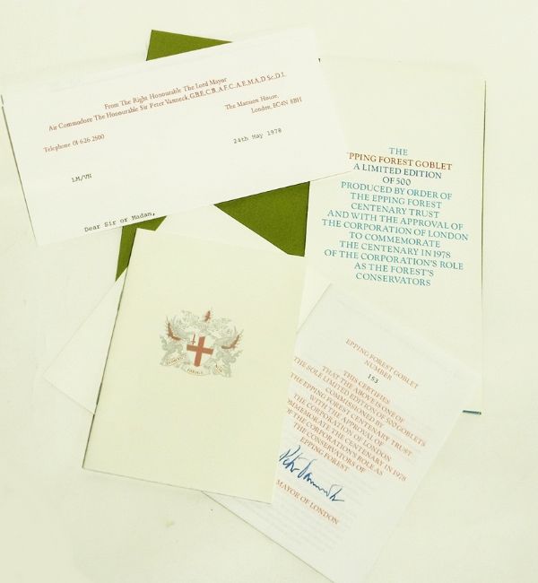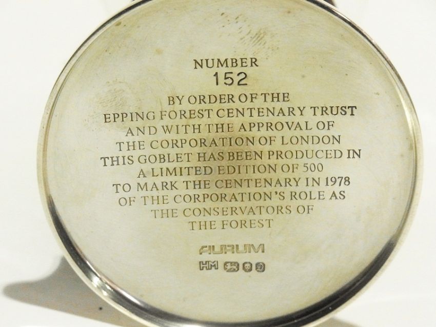 A pair of Aurum silver Epping Forest commemorative goblets, No.153/500, hammered-effect bowl above hollow stem depicting gilt stag behind leaves, London 1978, 55oz approx. combined (boxed with certificates)