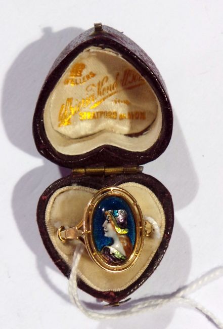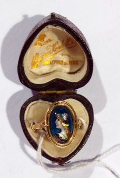 Gold and enamel ring, the openwork setting with oval enamel tablet bearing pre-Raphaelite head and shoulders portrait of a lady in cap, inscribed to reverse "Bonnadier, Limoges"