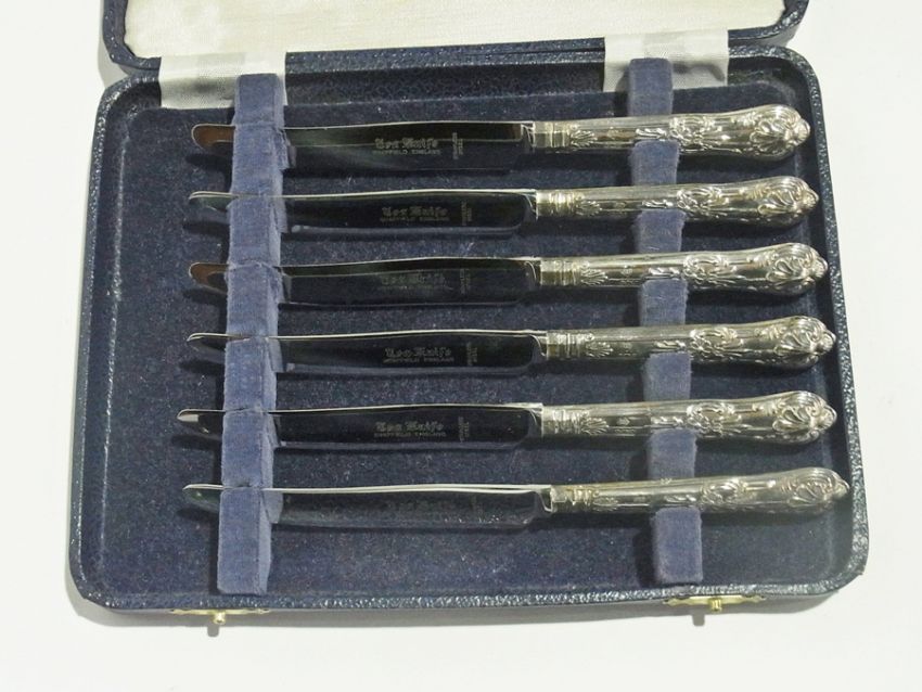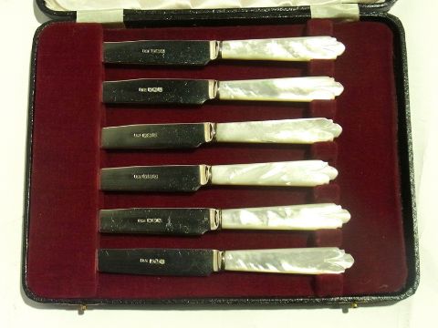 A set of six silver-handled tea knives with stainless steel blades (boxed) together with a further set of six silver-bladed tea knives with mother-of-pearl handles (boxed) (2)