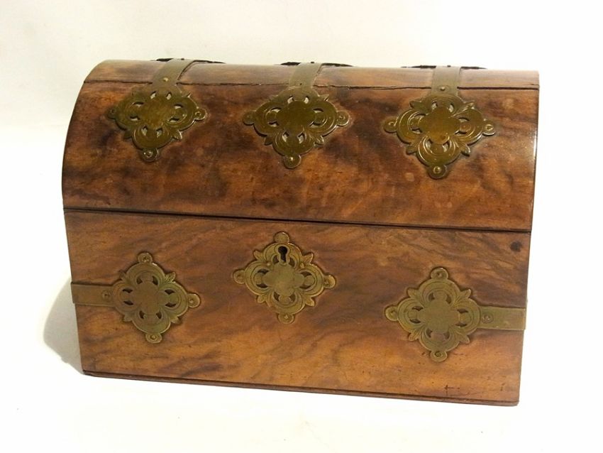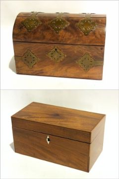 Mahogany converted tea caddy with inlaid ebony and boxwood stringing, Victorian dome topped casket with brass mounts (2)