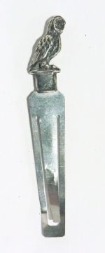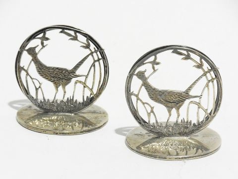 Pair of silver menu holders of pierced design in the form of pheasants, on circular bases, Birmingham 1911, 25oz approx. and an owl-topped bookmark