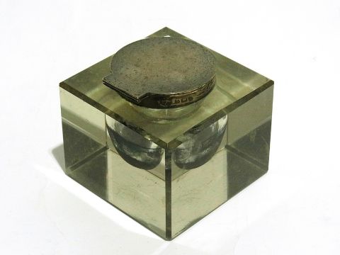 Edwardian ink well of square cut glass form with silver mounts, Birmingham 1908