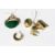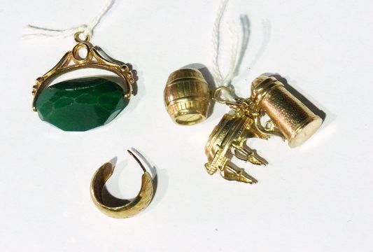9ct gold swivel fob with green faceted stone, three gold charms, cameo pendant and chain and sundry earrings