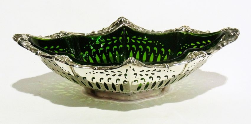 Early 20th century silver lozenge-shaped bonbon basket with applied scroll border decoration over pierced base, having green glass liner, Sheffield 1905, 11oz approx.